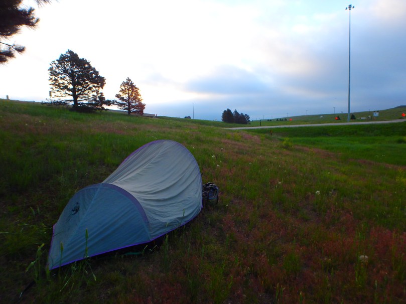 We made it to roadside at 6:30 that next morning and finally got picked up sometime shortly after 8. That was just the first of the 7 short-distance long-wait time rides we’d get that day. Despite an exceptionally kind soul stopping to offer us ice cream, a friendly police officer and an awesome lady who had been a solo hitch hiker as a teenager driving us to Wyoming, it was a profoundly awful day. We didn’t pack it in until our shadows got long and the horizon was flashing warning signals of bright colour that our time was running out. By that point, we’d made it just shy of 200 miles.